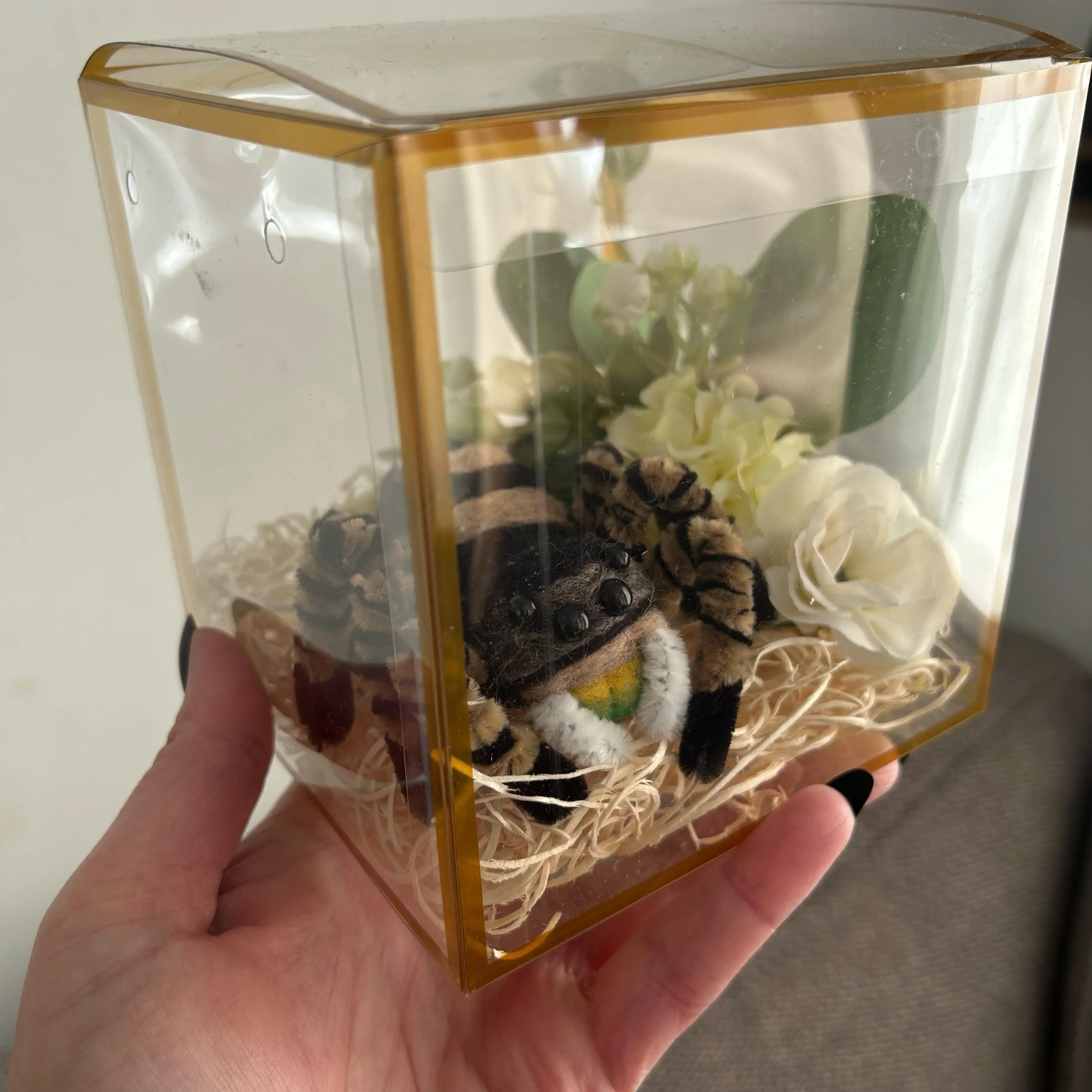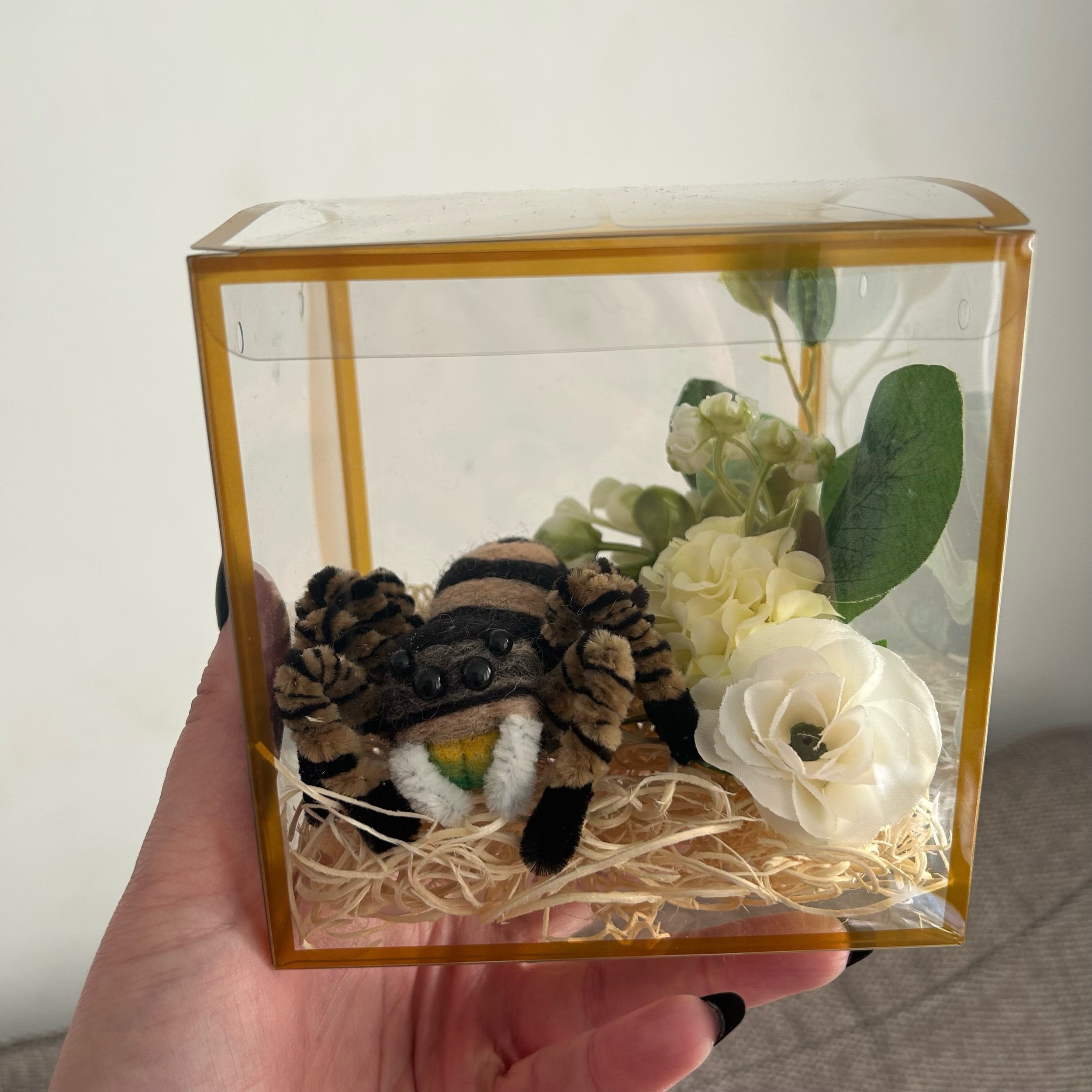 Each Spider comes with their very own, plastic faux enclosure for safe travels or to keep as part of a display if you wish!